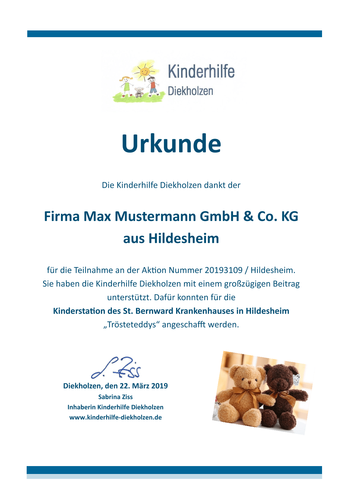Sie erhalten ab einer Bestellung von 5 Teddys auf Wunsch eine Sponsorenurkunde, die Sie in Ihren Geschäftsräumen aushängen oder auf Ihrer Internetseite veröffentlichen können, somit haben Sie die Möglichkeit Ihren Kunden zu zeigen, dass Sie sich für die Region sozial engagieren.