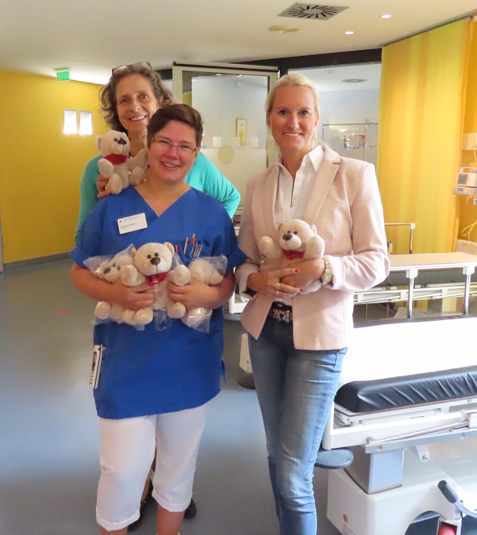Die Teddys sind ca. 30 cm groß und sollen in Notsituationen die kleinen Patienten ablenken und bei Untersuchungen und Behandlungen begleiten, sie sind ein Geschenk und dürfen natürlich nach der Notsituation mit nach Hause genommen werden.